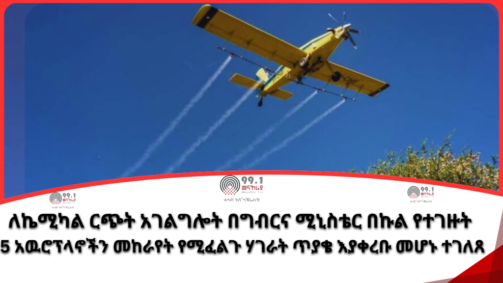 ታኅሳስ 10 ቀን 2017(መናኸሪያ ሬዲዮ) በቅርቡ ለኬሚካል ርጭት አገልግሎት የሚውሉ 5 የአውሮፕላን ግዢ መፈፀሙን ሚኒስቴር መስሪያ ቤቱ ያስታወቀ ሲሆን 10 ሚሊየን ዶላር ወጪ ስለማውጣታቸውም በወቅቱ ይፋ አድርጓል ፡፡