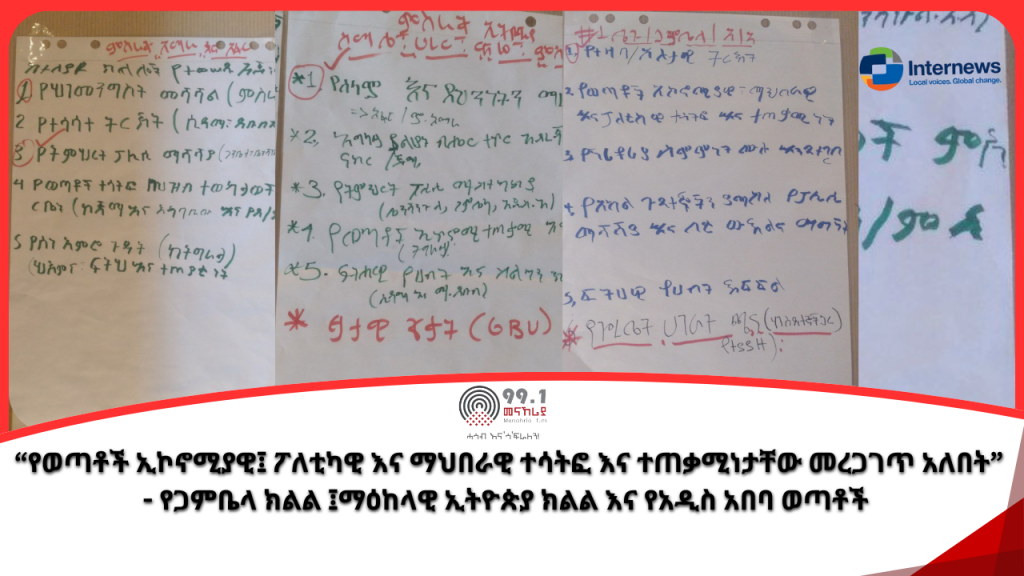 የሃገራዊ ምክክር ኮሚሽን ወጣቶችን ከማሳተፍ እና በሃገር ውስጥ የወጣቶችን ተጠቃሚነት ከማስጠበቅ አኳያስ ምን እየሰራ ነው በሚለው ጉዳይ የሃገራዊ ምክክር ኮሚሽንን ጨምሮ በኮሚሽኑ ውይይት ወቅት የተሳተፉ ወጣቶችንና የዘርፉ ባለሙያዎችን ተዘዋውረን አነጋግረናል፡፡